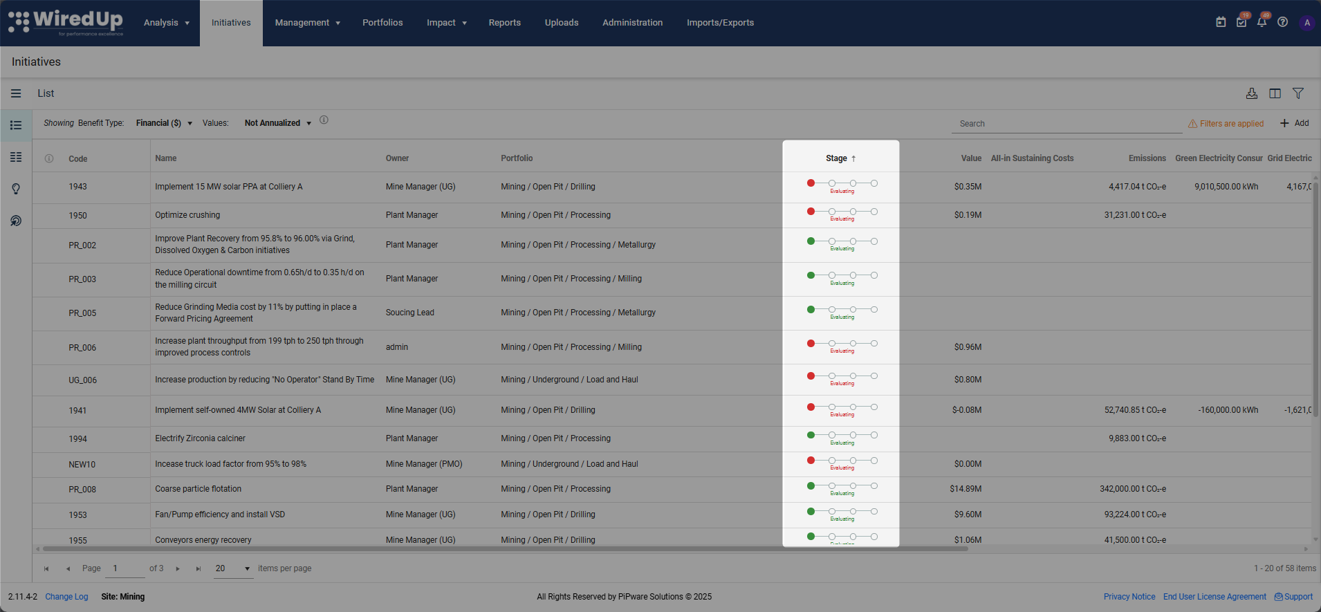 The Stage column indicates what stage the Initiative is currently progressing through:
