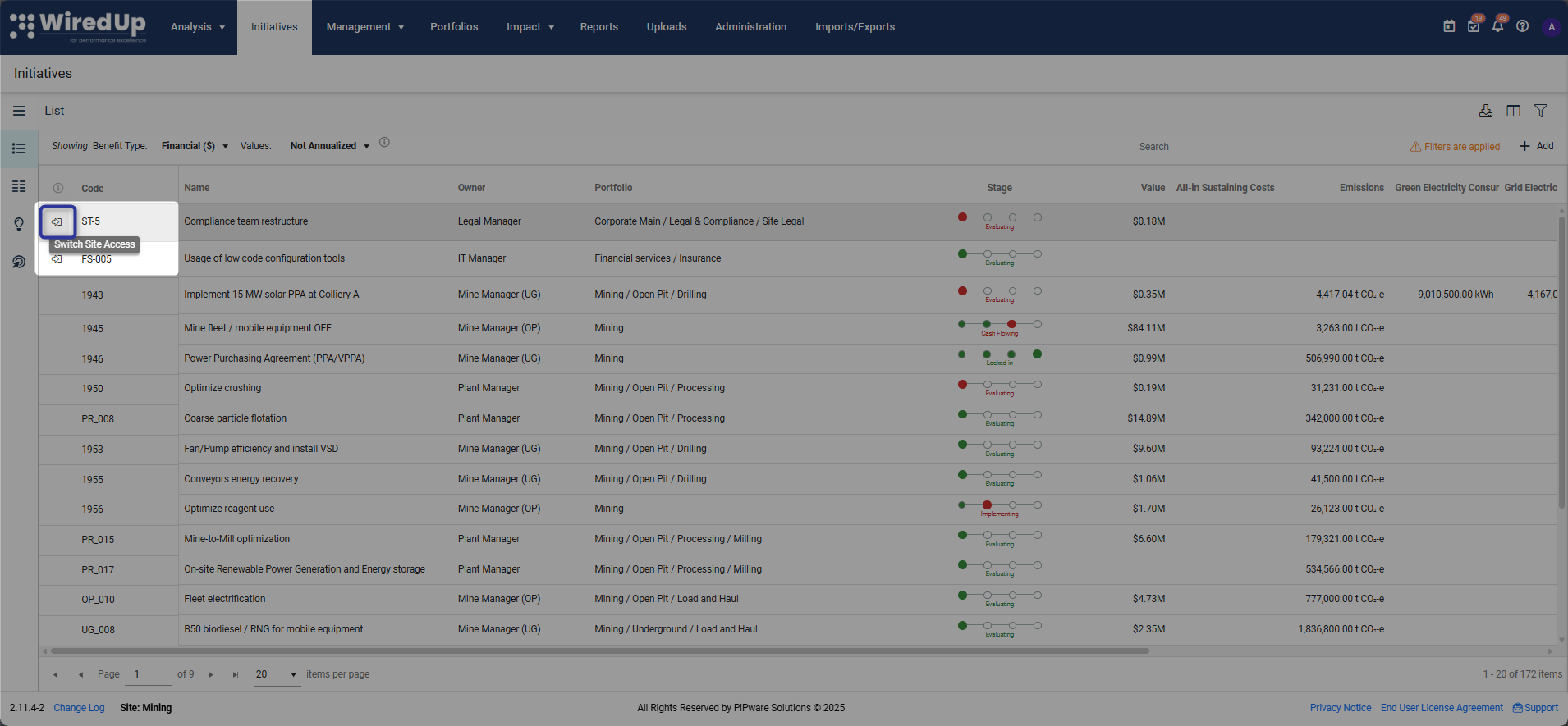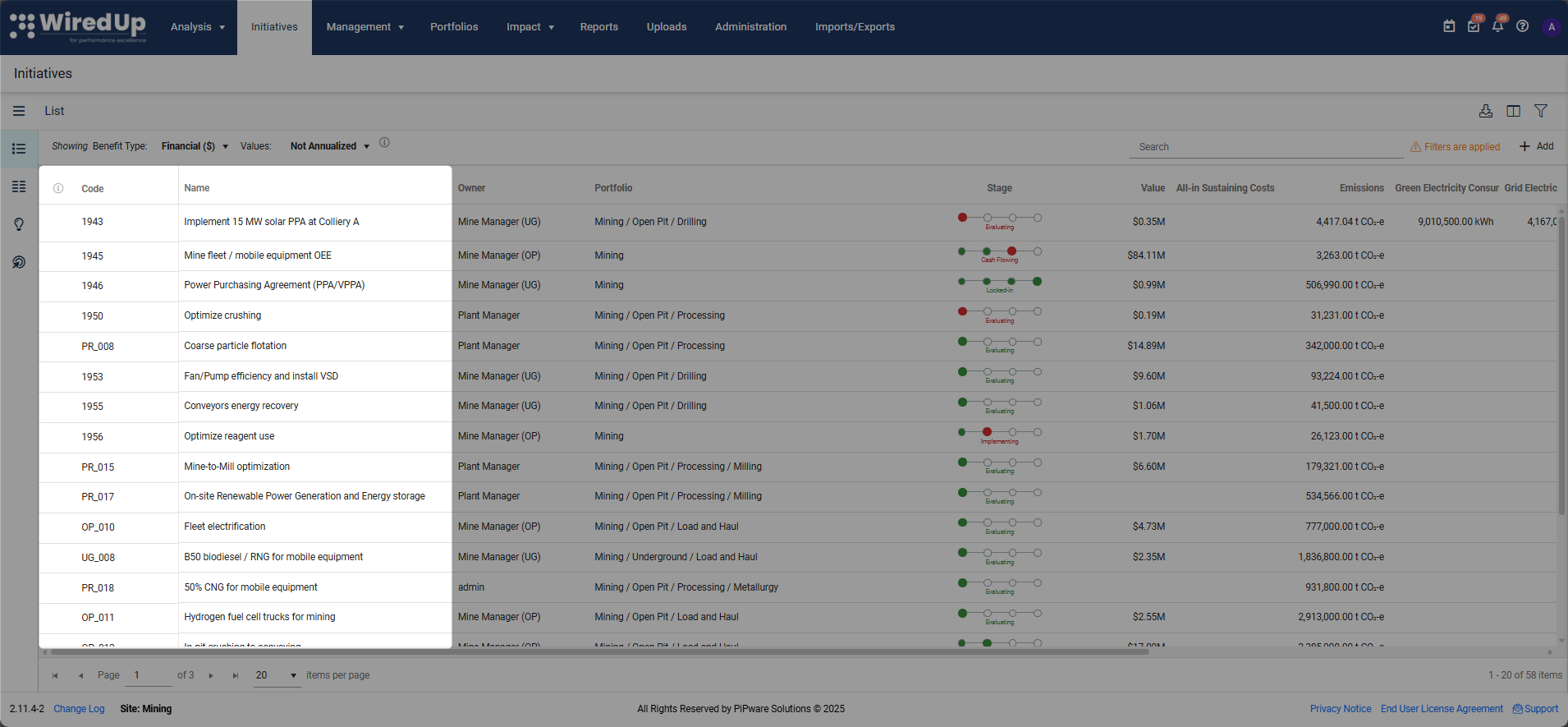 - Click on any initiative's Code or Name to open and view the full initiative details