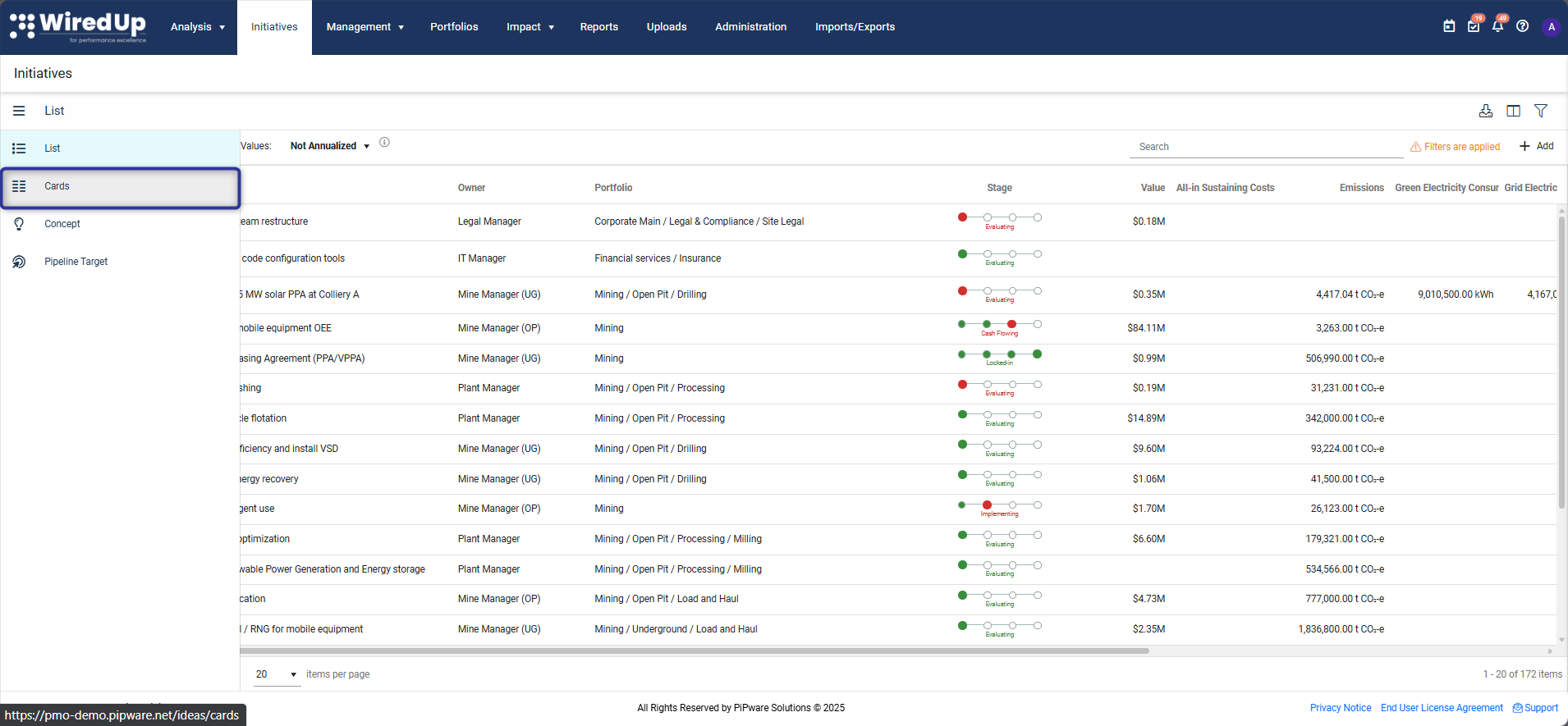 The Cards View provides a visual, stage-based representation of your initiatives, making it easy to see the status and progress of ideas at a glance.