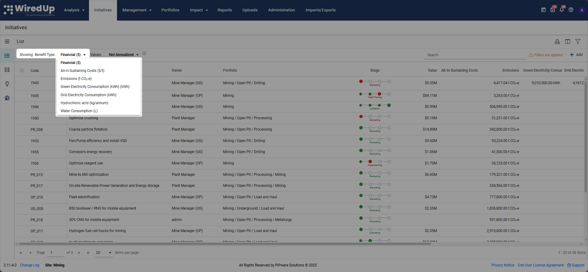 - Any configured Non-Financial benefit types (e.g., Emissions, Quality metrics)