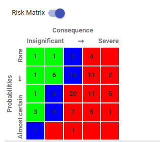 - Severity: The overall risk rating calculated based on consequence and probability (e.g., Very Low, Low, Medium, High, Very High), displayed with color coding