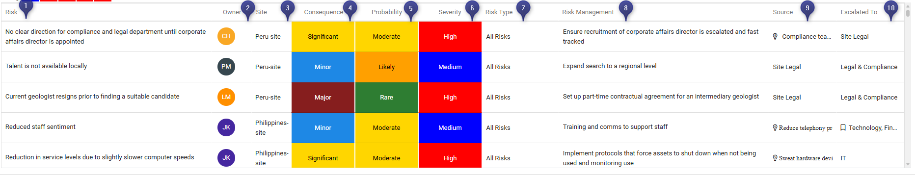 - Sorting: Click on the following column headers to sort the table: Owner, Site, Consequence, Probability, Severity, Risk Type, Source, and Escalated To