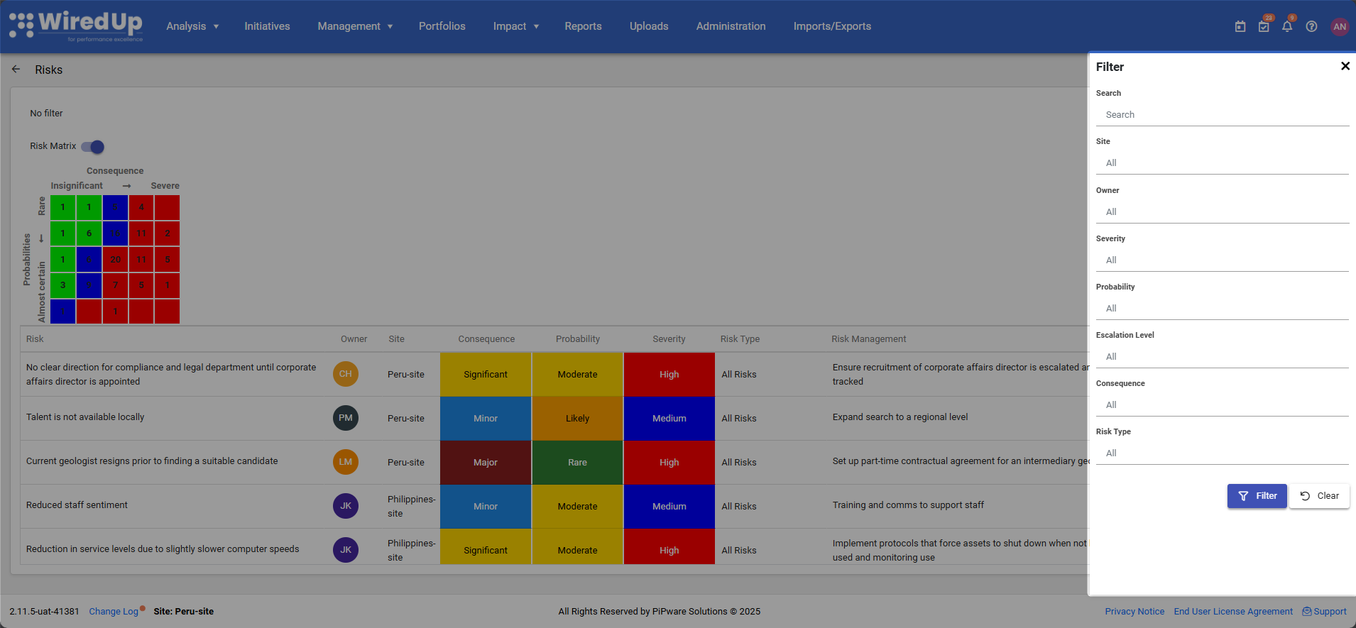 - Use Probability and Consequence filters together to identify specific risk profiles (e.g., high probability + high consequence)