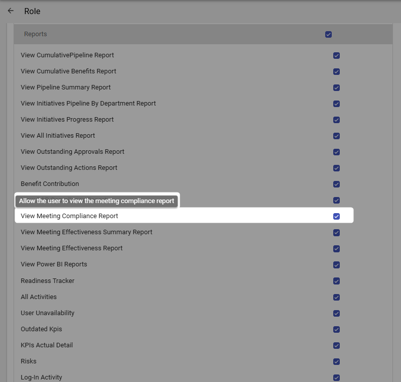 Note: Users need the View Meeting Compliance Report permission enabled in their role under Reports to be able to access and use this report. If you cannot view this report, please contact your system administrator to verify your permissions.