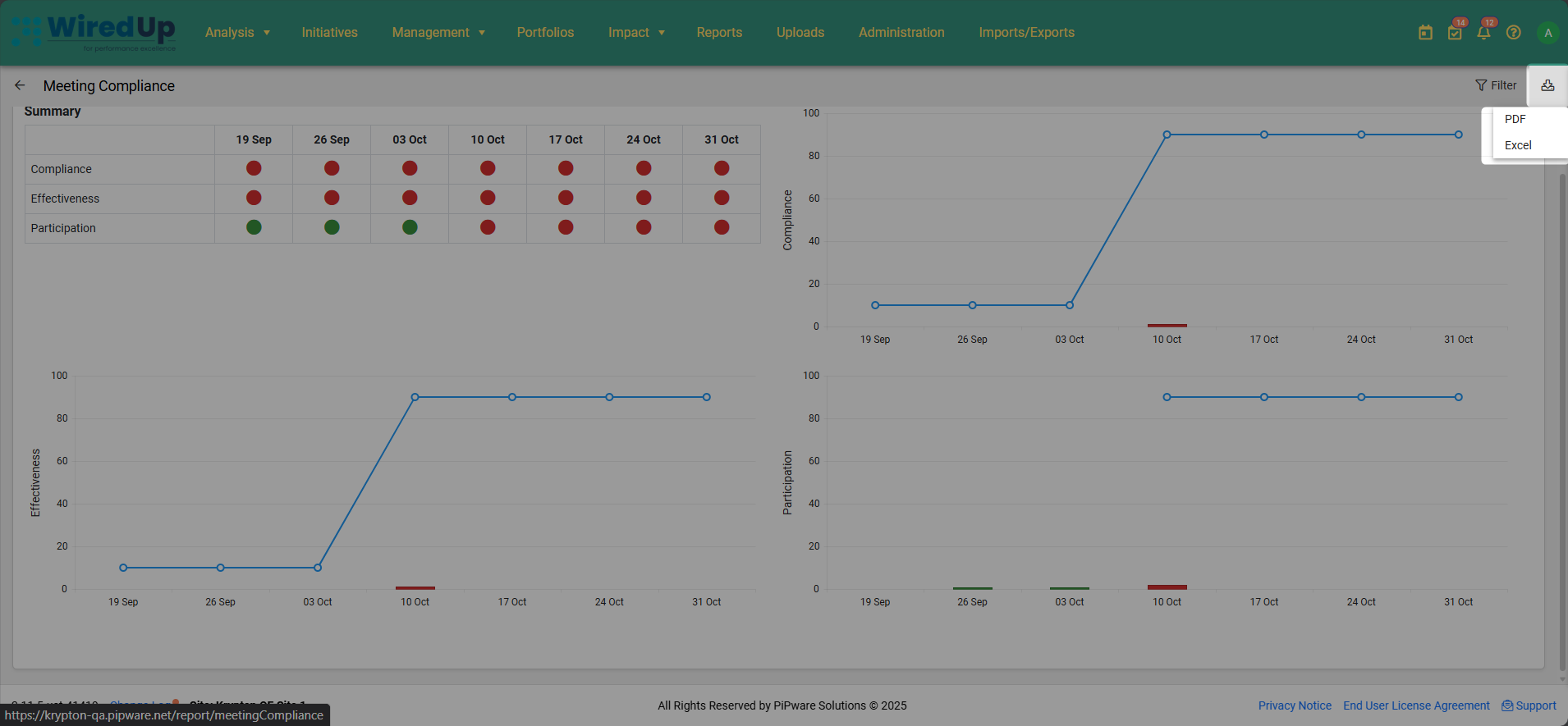 The Meeting Compliance Report provides a visual representation of meeting performance across three key metrics: compliance, effectiveness, and participation. This report helps managers and administrators monitor whether meetings are being conducted according to organizational standards and targets by displaying actual performance against predefined targets over a specified period. The report uses charts and a summary table to highlight trends and identify areas requiring attention.
