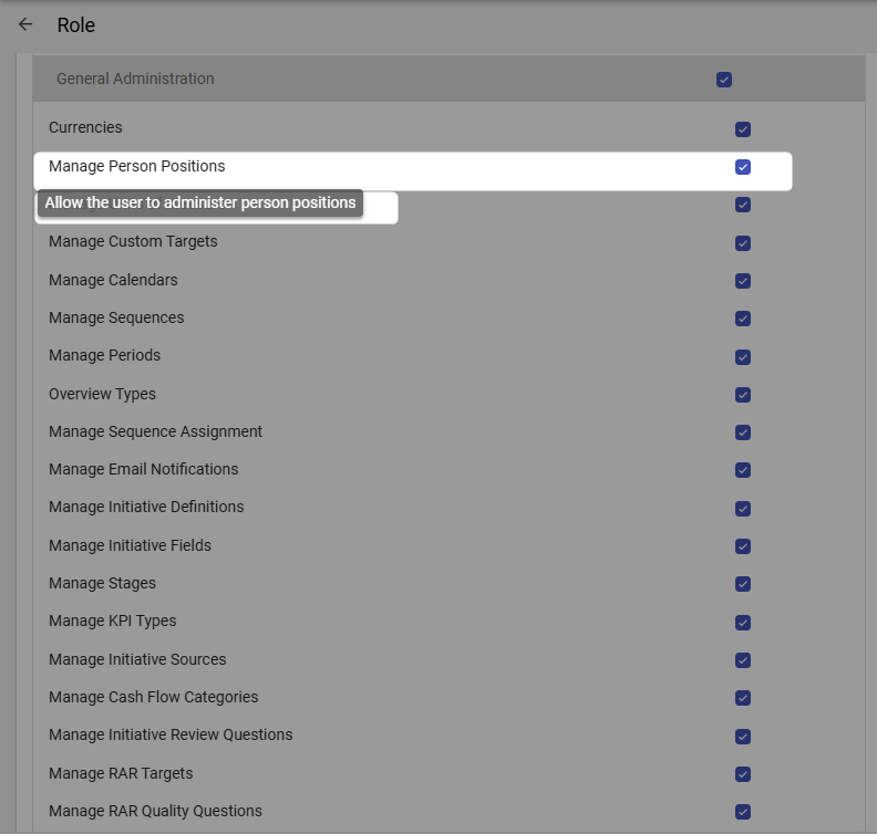 Note: Users need the Manage Person Positions permission enabled in their role under General Administration to be able to access and manage person positions. If you cannot access this feature, please contact your system administrator to verify your permissions.
