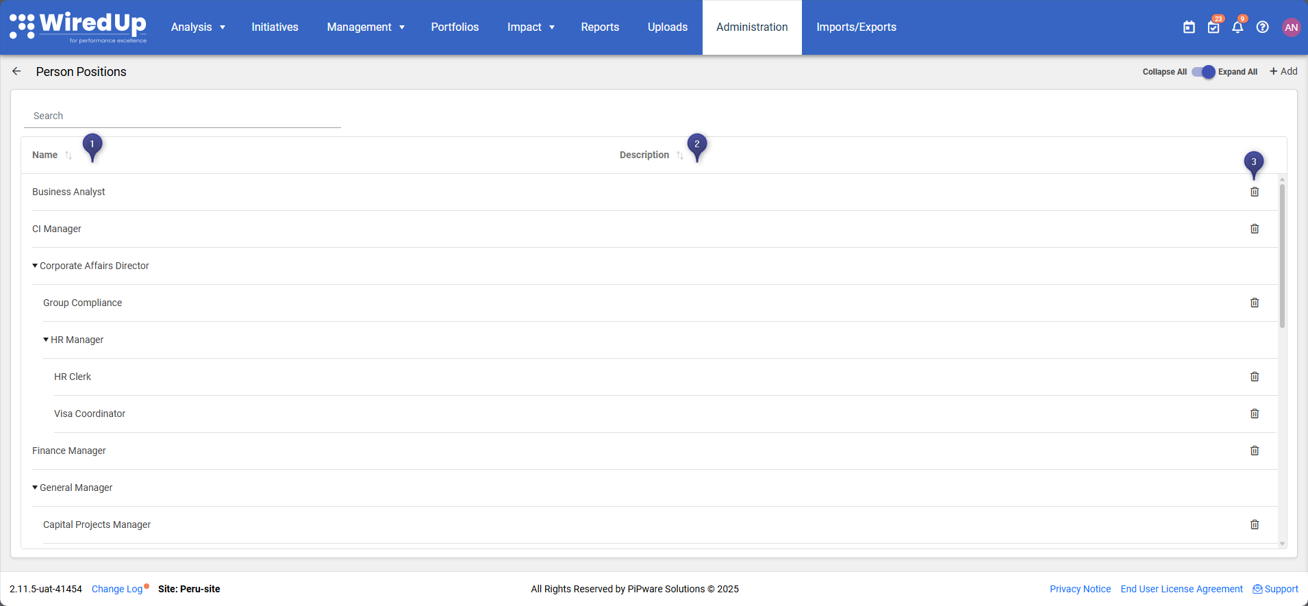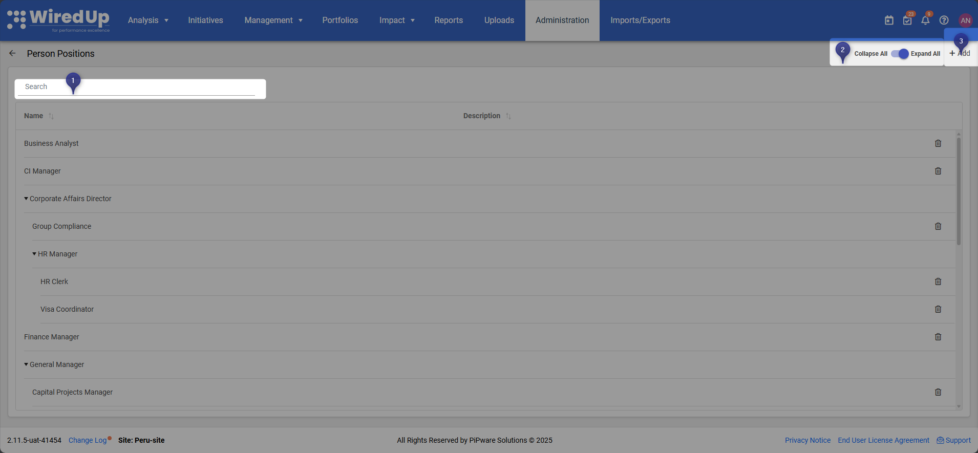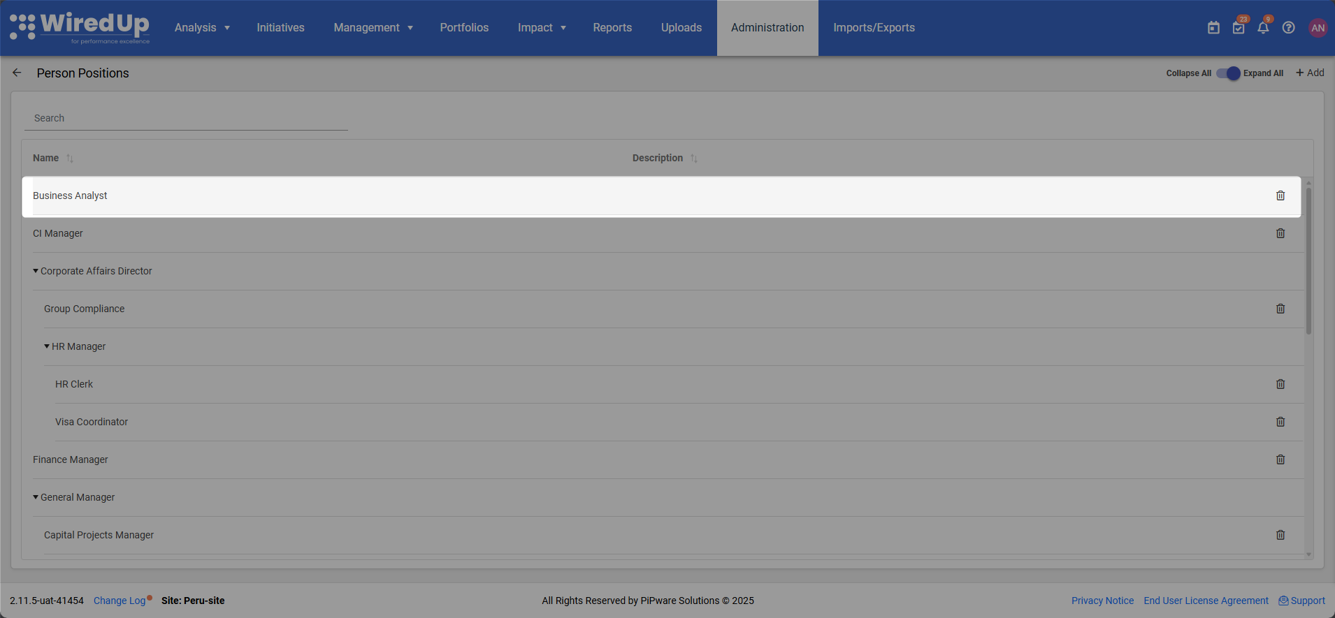 Person Positions is an Administration feature that allows you to create and manage a list of organizational positions or job titles within the WiredUp system. These positions can be assigned to users in the system and are used to define organizational hierarchy and reporting structures. Person Positions help organizations maintain clear role definitions, support organizational structure management, and enable position-based filtering and reporting throughout the system.