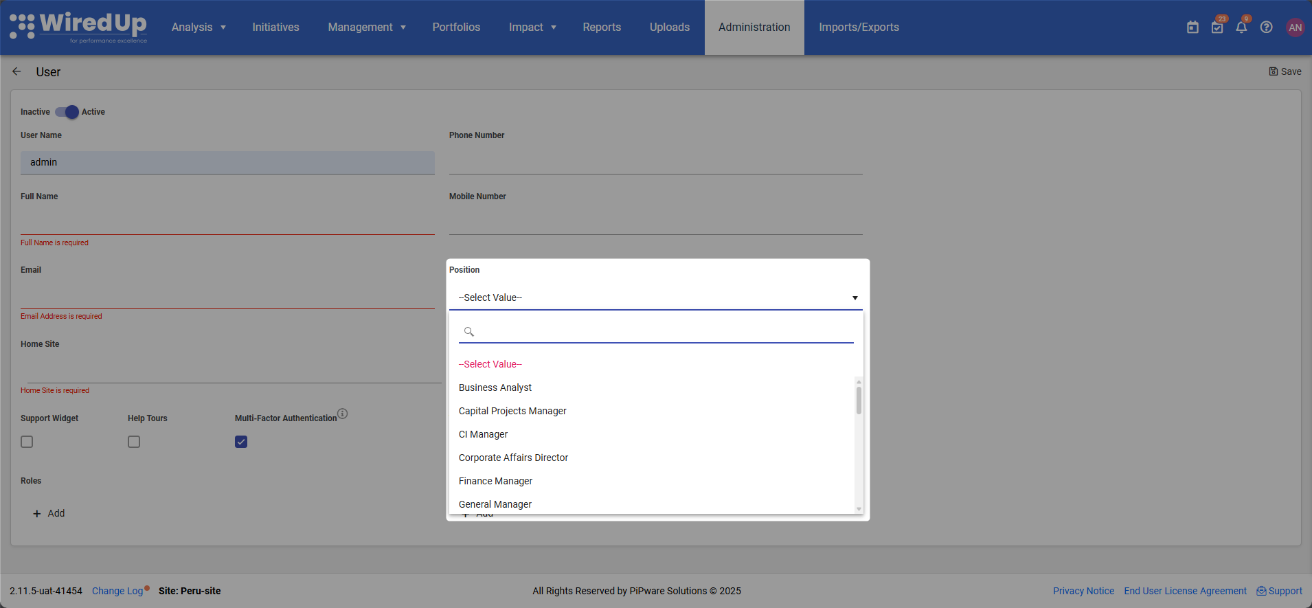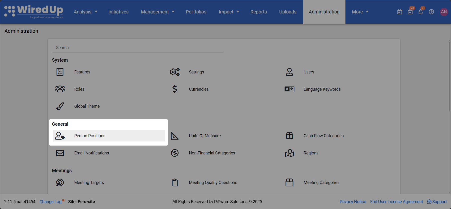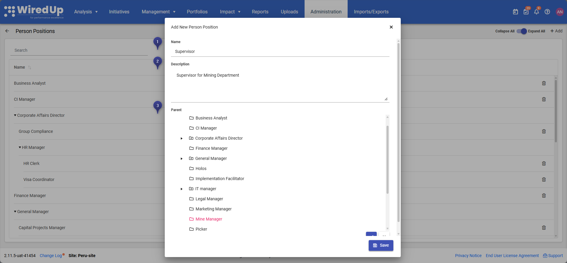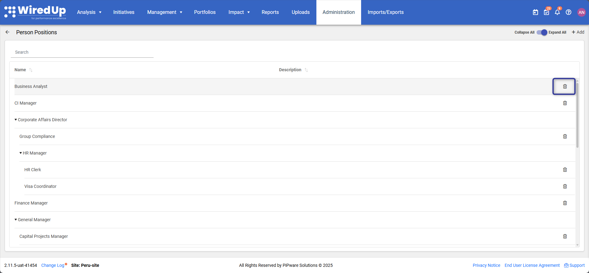 Person Positions is an Administration feature that allows you to create and manage a list of organizational positions or job titles within the WiredUp system. These positions can be assigned to users in the system and are used to define organizational hierarchy and reporting structures. Person Positions help organizations maintain clear role definitions, support organizational structure management, and enable position-based filtering and reporting throughout the system.