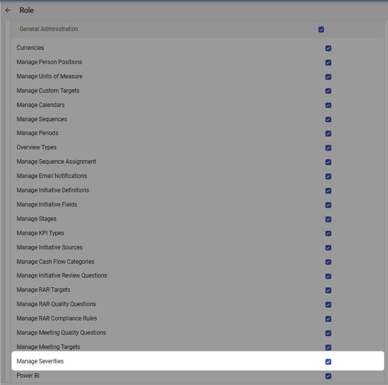 Note: Users need the Manage Severities permission enabled in their role under General Administration to be able to access and configure the Severity Matrix. If you cannot access this feature, please contact your system administrator to verify your permissions.