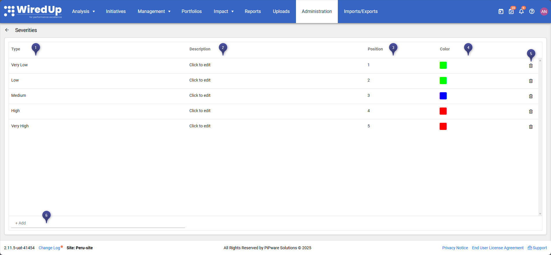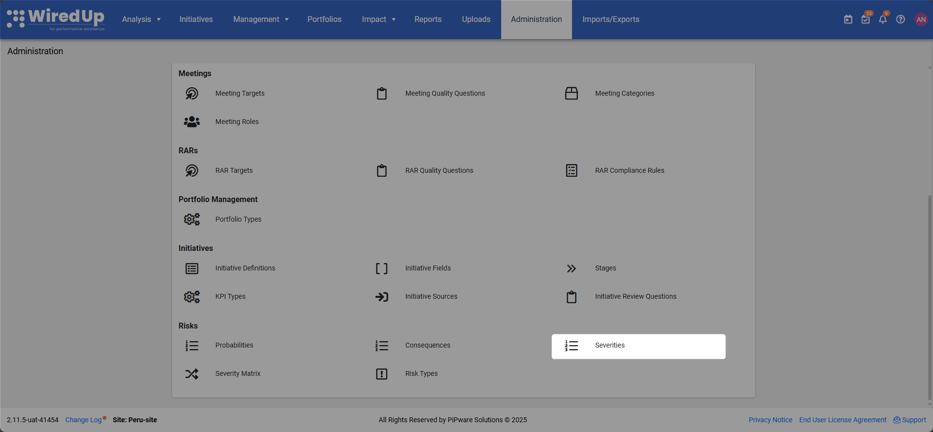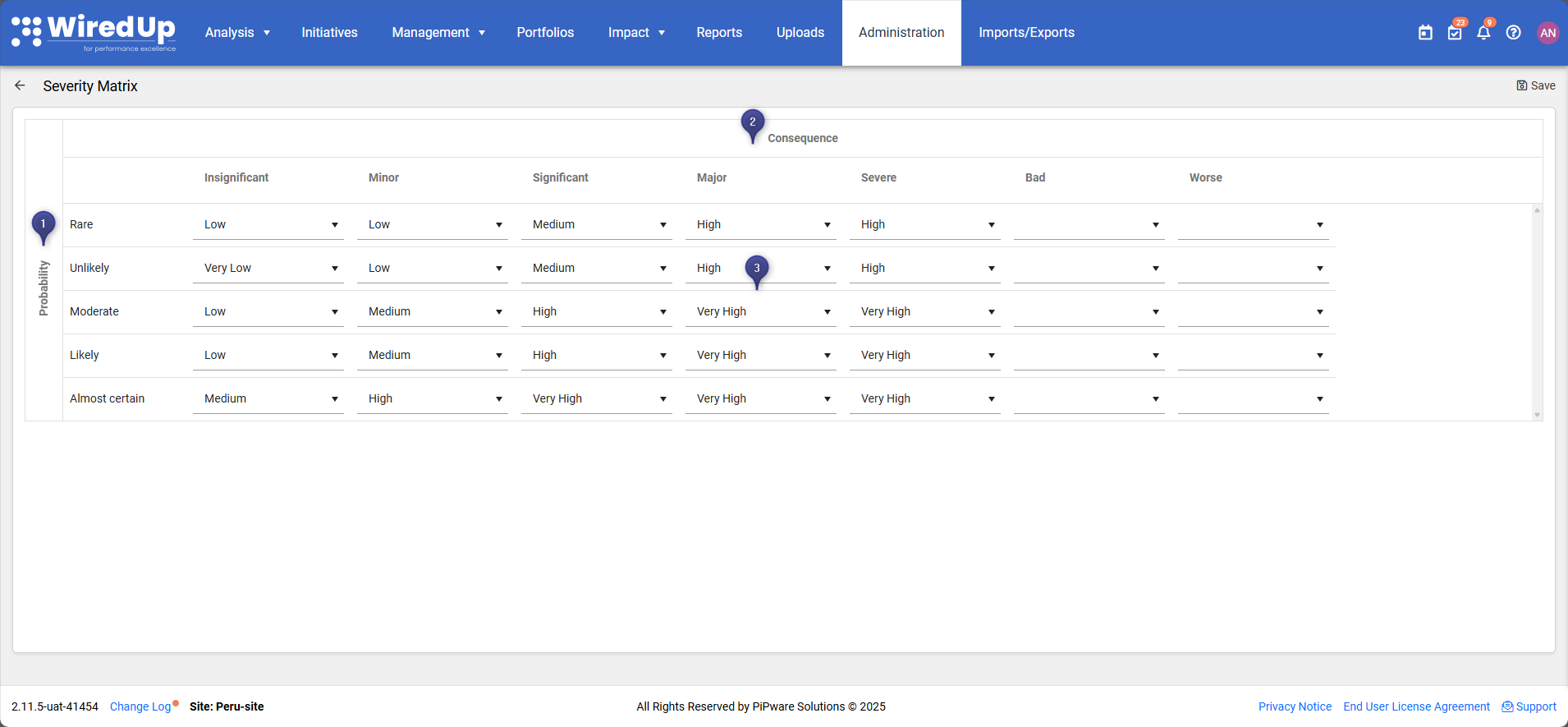 The Severity Matrix is an Administration feature that allows you to configure and manage the risk severity assessment framework used throughout the WiredUp system. This matrix is used to measure and visualize the severity of idea/initiative risks by combining probability and consequence ratings. The Severity Matrix provides a standardized approach to risk assessment, helping organizations consistently evaluate and prioritize risks across all ideas/initiatives. The configured matrix is displayed wherever risk assessment is required in the system, including the Risk Report, idea/initiative risk pages, and risk-related dashboards.