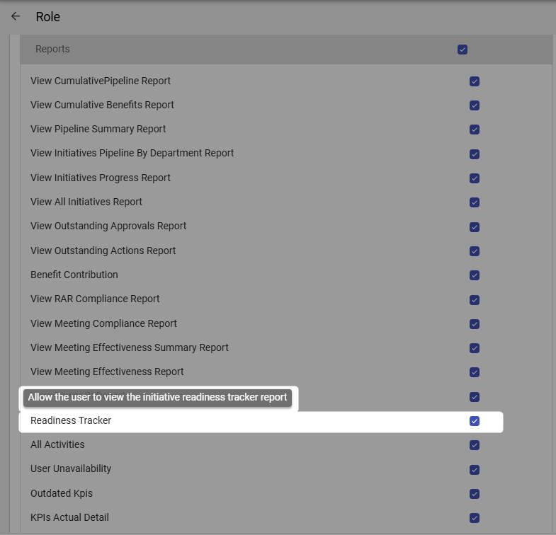 Note: Users need the Readiness Tracker permission enabled in their role under Reports to be able to access and use this report. If you cannot view this report, please contact your system administrator to verify your permissions.