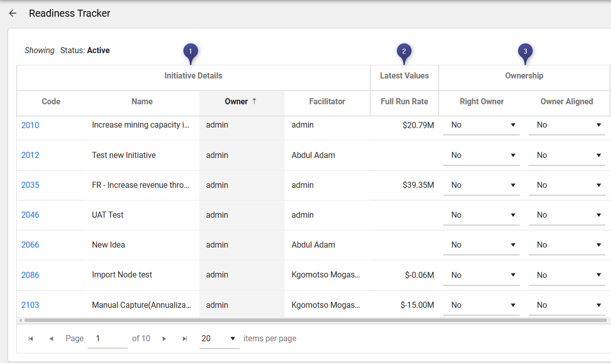 - Total count: The bottom right of the table displays the total number of ideas/initiatives
