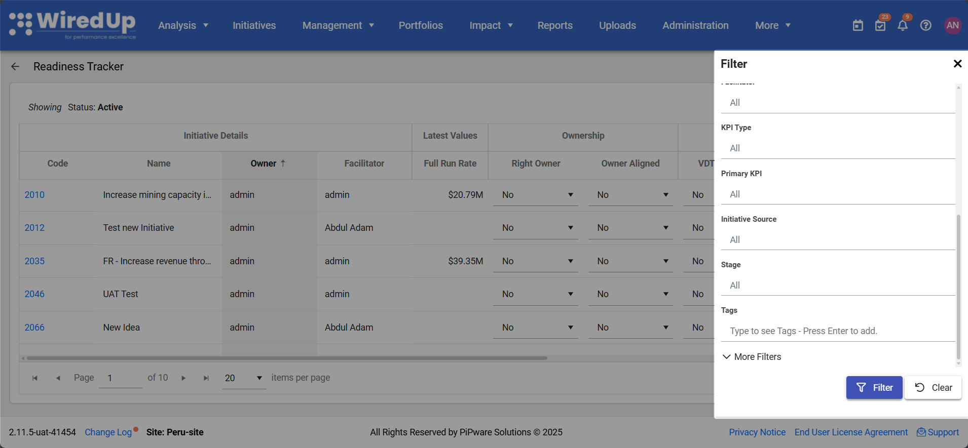 - Filter by Stage to assess readiness for ideas/initiatives at specific pipeline stages