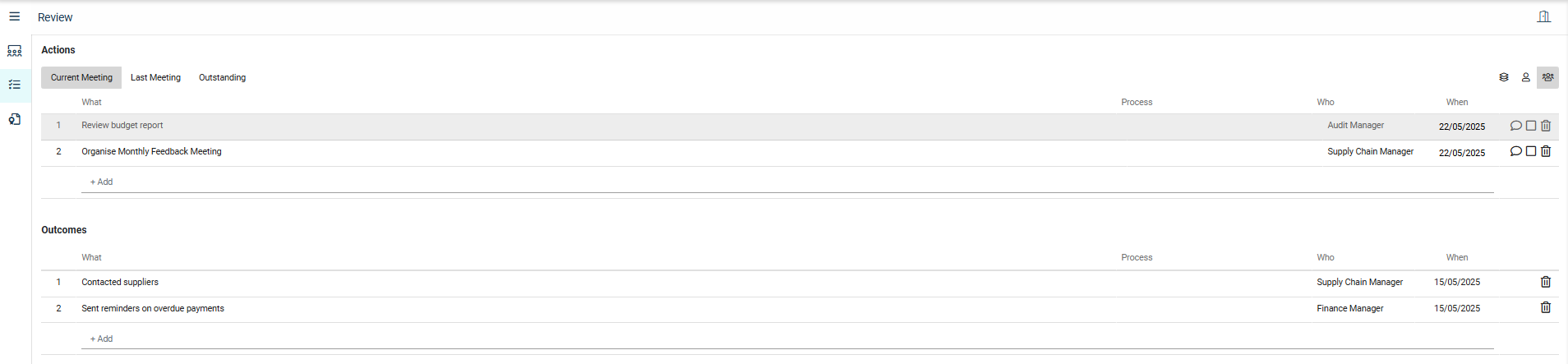 En esta sección, puede revisar las acciones y los resultados de la reunión. Las acciones que no sean específicas de un proceso también se pueden añadir aquí haciendo clic en el botón +Añadir situado en la parte inferior de cada sección. Al igual que en la sección Acciones de la pestaña Reuniones, puede mostrar el Área de acciones de la reunión, sus propias acciones o todas las acciones. También tiene la posibilidad de introducir comentarios, marcar la acción como Completada o Eliminar la acción o el resultado.