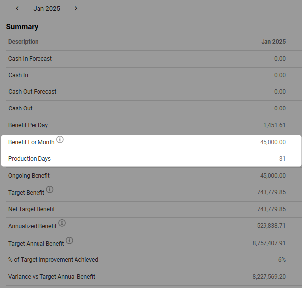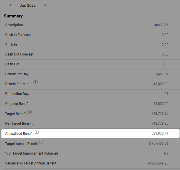 • El beneficio anualizado se calcula de la siguiente manera: (beneficio objetivo / días de producción) * duración del beneficio.